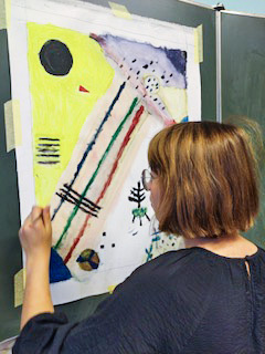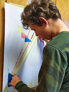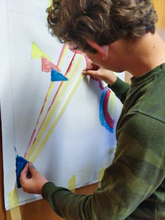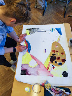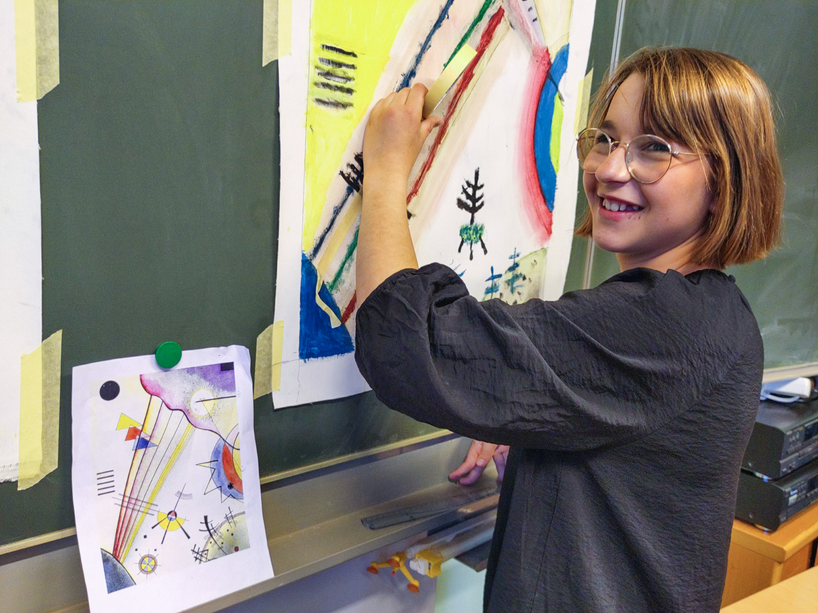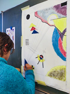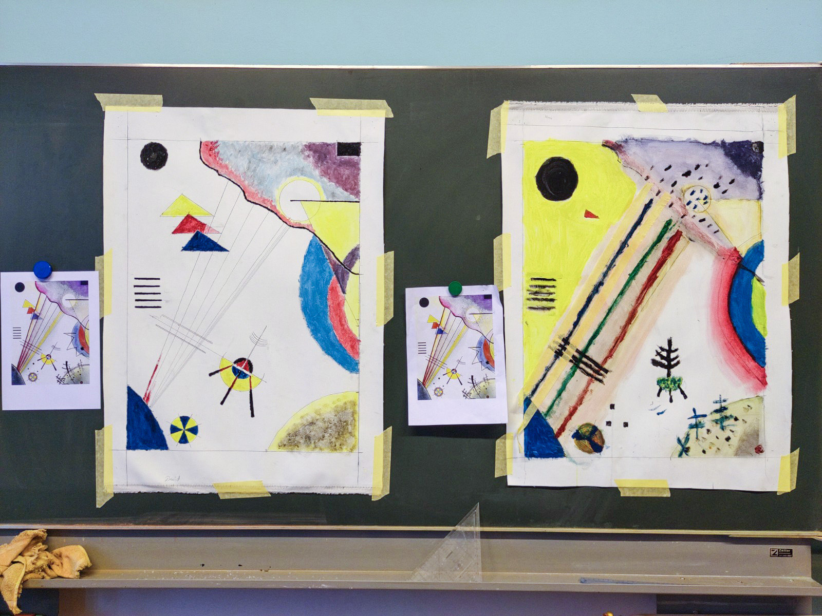 Zum Abschluss einer Geometrie-Epoche setzte die 8. Klasse das Gelernte künstlerisch um: Genaues Abmessen, Maßstabsberechnungen, Schnittpunkte berechnen sowie der Einsatz von Zirkel und Lineal waren gefragt, als die Vorlage von Kandinsky dreifach vergrößert abgebildet werden sollte. Auch die Künstlerpaletten wurden selbst hergestellt! Die Schülerinnen und Schüler sind zu Recht stolz auf die so entstandenen Kunstwerke.
