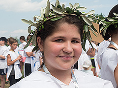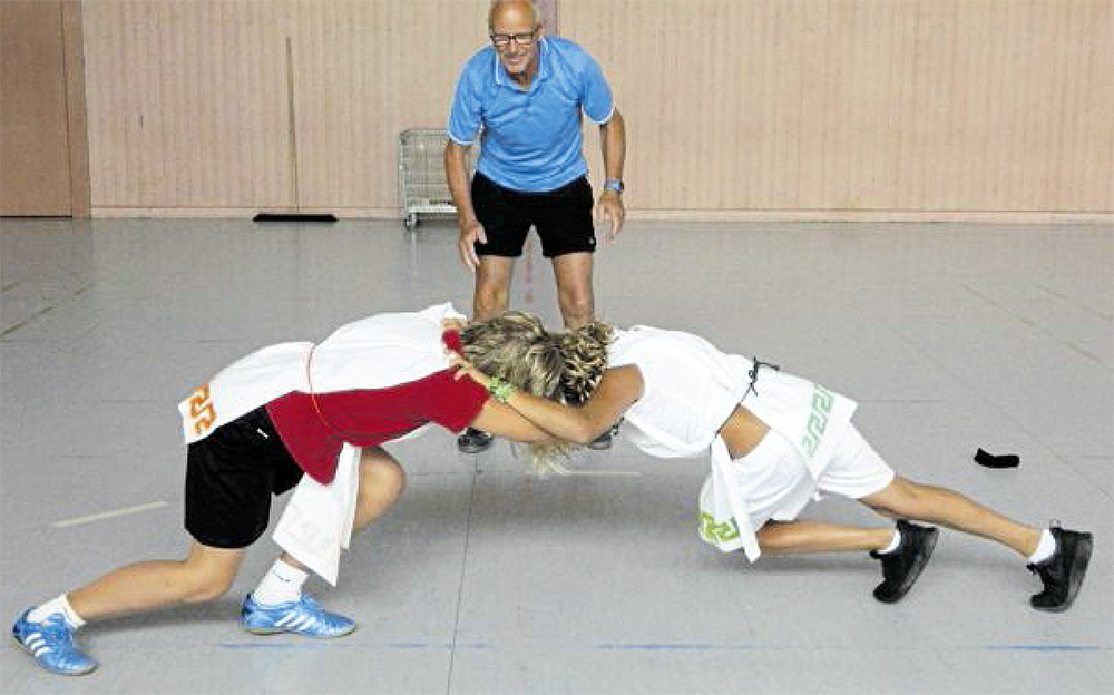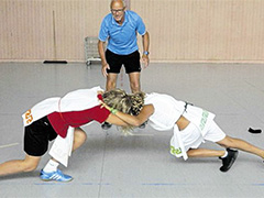 Auf gegenseitige Tuchfühlung im Wortsinne gehen die Athleten beim Ringen. Sie versuchen, den Gegner unter heftigem Anfeuern ihrer Mannschaft aus dem Ring zu kämpfen. Überraschend zu sehen, welche Kräfte doch in manch zartem Kinde stecken! Nach fünf Wettbewerben steht am End die Siegerehrung an. Epidauros trägt diesmal den Sieg davon und wird dafür mit dem Lorbeerkranz geehrt. Statt einer maßgefertigten Statue, die die Sieger ehrt und verewigt, wie es bei den Griechen Brauch war, dürfen die hungrigen Wettkämpfer ihre leere Mägen nun am griechischen Buffet füllen, das von den Eltern organisiert wurde. Mit dem Ende dieses Tages erlischt dann auch langsam das griechische Feuer, in dessen Licht die Schülerinnen und Schüler ein Schuljahr lang standen. Sie haben die griechische Kultur dabei kennengelernt, nachempfunden und auch nachgelebt. Die Olympiade als Höhepunkt des Jahresthemas ist kein einfaches Sportfest: Es bringt den griechischen Olymp einmal ganz nah – auf den Engelberger Sportplatz.
