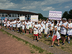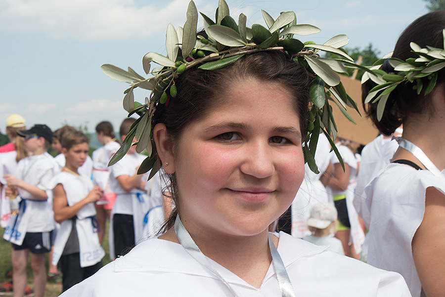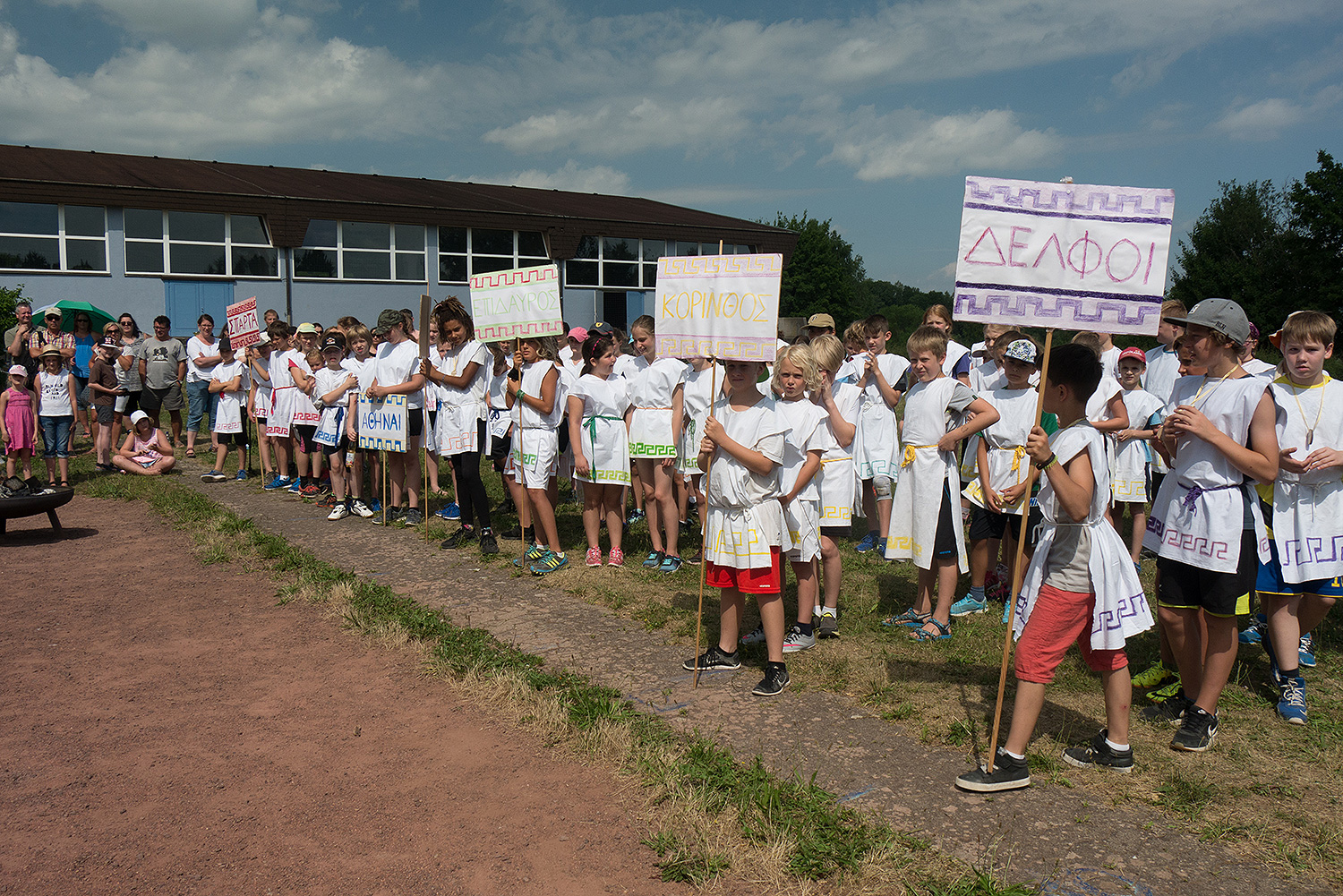 Fanfaren und Trompeten erklingen an diesem Samstagvormittag über den Sportplatz auf dem Engelberg. Die fünften Klassen der Freien Waldorfschule Engelberg und der Magdalenenschule Winterbach sowie der Helmut-von-Kügelgen-Schule Fellbach haben sich versammelt, um gemeinsam das griechische Sportfest, die Olympiade, zu feiern. Auf den Rängen hocken Dutzende Mütter, Väter, Geschwister und Großeltern in der warmen Morgensonne. Zu den feierlichen Klängen ziehen von links die Mannschaften mit insgesamt rund 80 Wettkämpfern an den Zuschauern vorbei. Auf den Schildern ist in altgriechischen Lettern zu lesen: Aus Mykene, Epidauros, Korinth, Delphi, Sparta und Athen sind sie angereist. In den kommenden zwei Stunden werden sie sich in den klassischen Disziplinen Speer- und Diskuswurf, Laufen, Springen und Ringen miteinander messen.