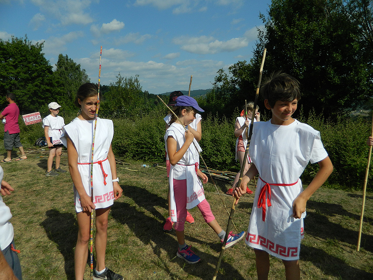 Die fünfte Klasse der Waldorfschule steht ganz im Zeichen der Kultur der Griechen – mit der Olympiade als Höhepunkt. Seit 15 Jahren gestalten die Sportlehrer gemeinsam mit den Klassenlehrern auf dem Engelberg dieses Ereignis. Die Schülerinnen und Schüler haben dabei zuvor nicht nur schon viel über die Geschichte und Kultur der Griechen erfahren, sondern auch fächerübergreifend dazu gearbeitet: Lieder und Tänze einstudiert, griechische Umhänge genäht und bemalt, aber auch den Speer aus einem langen Holzast geschnitzt und ge-staltet, so dass beim Wettkampf keiner dem anderen gleicht und jeder ein Kunstwerk für sich ist. Und natürlich im Sportunterricht fleißig trainiert, etwa wie man den Diskus nach Art der Griechen wirft: Diskus präsentieren, rausrollen und dann möglichst weit werfen. Die Fünftklässler sind beim Wurf ganz konzentriert, schließlich soll die Scheibe nicht irgendwo den Rasen rasieren, sondern im Zielbereich landen. Jubel bei allen, wenn es gelungen ist! Mit der Teilnahme der Magdalenenschule konnte in diesem Jahr die inklusive Arbeit auf dem Engelberg im Sportunterricht der fünften Klassen auch in der Olympiade umgesetzt werden. Außerdem bereicherte die Kooperation mit der Helmut-von-Kügelgen-Schule aus Fellbach den sportlichen Wettstreit.
