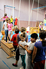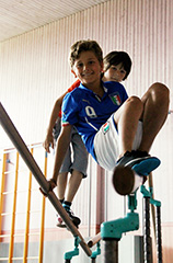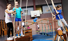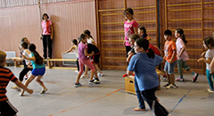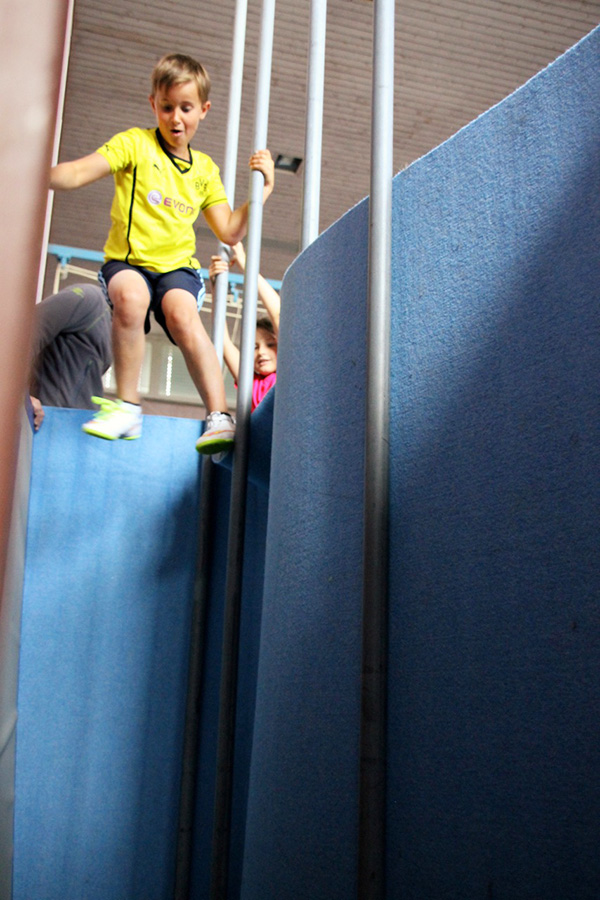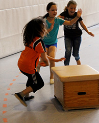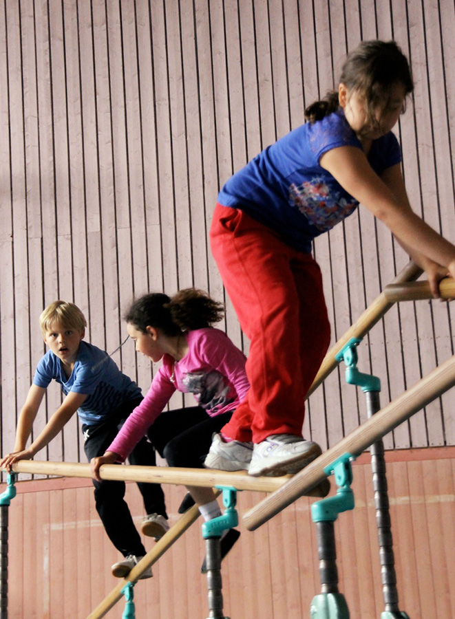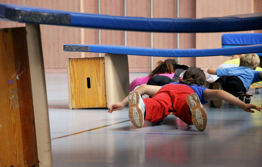 Wöchentlich abwechselnd bewähren sich die Schülerinnen und Schüler in einer von den beiden Sportlehrern liebevoll aufgebauten Bewegungslandschaft, kriechen, hüpfen, schwingen am Seil, klettern irgendwo hoch, oder aber sie geben sich den, immer wieder unterschiedlichen, Herausforderungen der abwechslungsreichen Spiele hin.