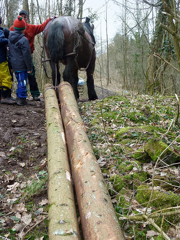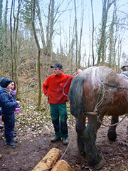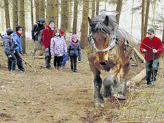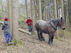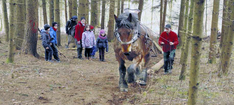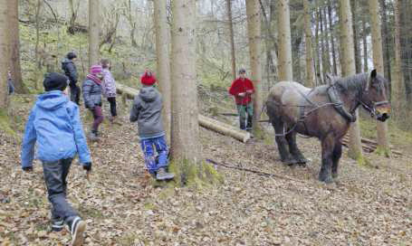 Die Schüler der Magdalenenschule stehen am Hang und beobachten die Kraftdemonstration des belgischen Kaltbluts. Es gehört schon einiges an Geschick dazu, bei Mensch und Pferd, so hat Sartorius den Schülern schon vorher erklärt. Gegenüber anderen Tätigkeiten, wie eine Kutsche zu ziehen, ist das Holzrücken so ziemlich das Schwierigste. In zu steilen Lagen auf dem weichen Waldboden tut sich das Pferd schwer, weil es keinen Halt findet – obwohl seine Hufe mit Spikes ausgestattet sind, wie Julian Sartorius den Schülern zeigt, indem er einen Huf hochhebt: zwei dicke Metallzapfen, die aus dem Eisen ragen.