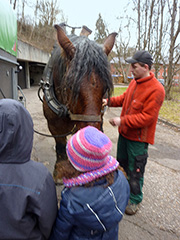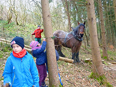 Die Hauptattraktion an diesem Donnerstagmorgen ist natürlich Max. Der bekommt nach getaner Arbeit noch Belohnungen: mitgebrachte Karotten und Äpfel, mit denen die Schüler ihn füttern dürfen. Nebenbei bringt Julian Sartorius ihnen einiges über die Anatomie des Pferdes bei. Zum Beispiel, dass die Urpferde klein waren wie Hunde – kaum vorstellbar bei dem Riesen Max, der selbst groß gewachsene Menschen überragt. Und dass die Urpferde noch viele Zehen hatten. Die Reste davon kann man noch sehen, zeigt Sartorius an den Hufen, zum Beispiel am Sporn, der hinten am Fuß rausguckt. Damit wäre also der Naturkunde- oder Bio-Unterricht auch noch anschaulich abgedeckt – ein rundum tierisch lehrreiches Waldabenteuer.