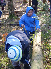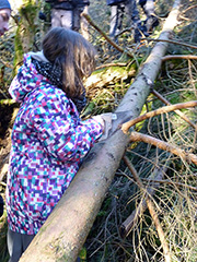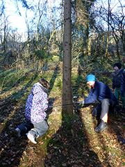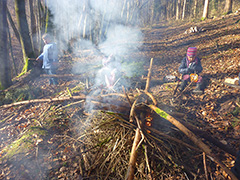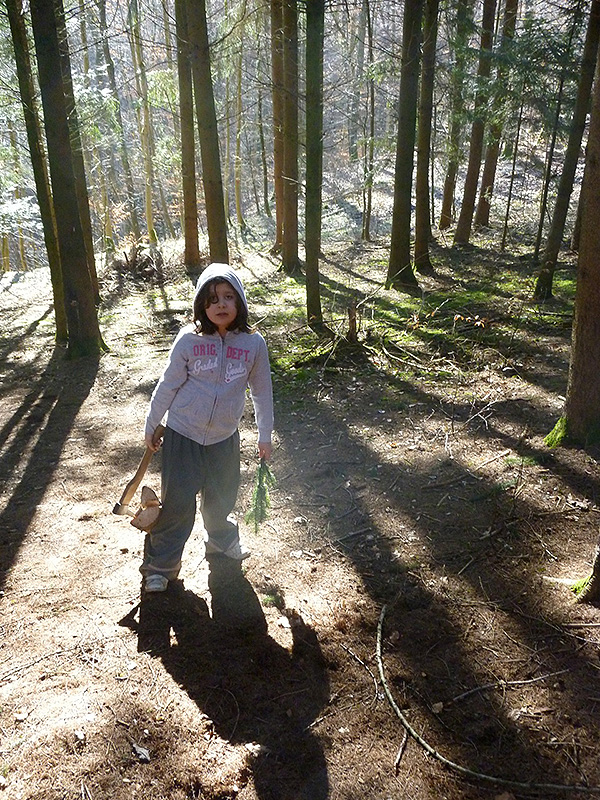 Die Drittklässler von der Magdalenenschule sind mit ihrer Klassenlehrerin Dorothee Raiser jetzt den zweiten Tag im Wald. Am ersten Tag, schon vergangene Woche, haben sie die drei Fichten gefällt, unter Anleitung und mit Hilfe eines Lehrers, der zufällig auch Forstingenieur ist. Mit Sägen und Äxten haben sie die Stämme entastet. Das Kleinholz haben sie als Brennmaterial zur Schule geschafft." Das hat sie richtig an ihre Grenzen gebracht", erzählt Lehrerin Dorothee Raiser.